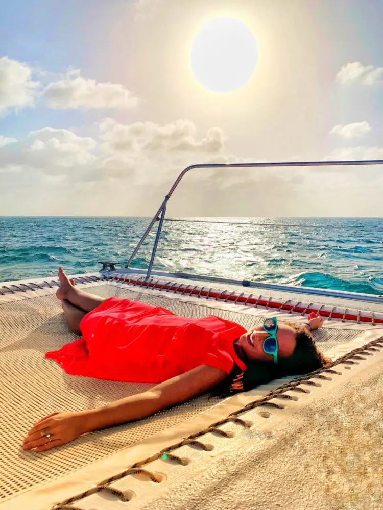 Woman laying on boat net